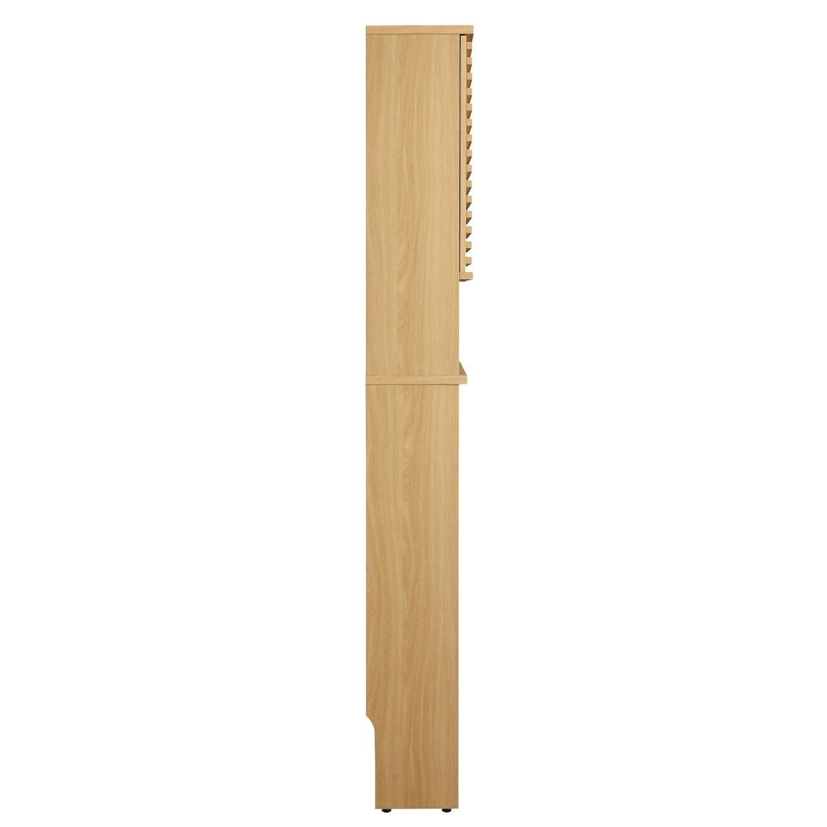 Save space while adding style with this over-the-toilet bathroom storage cabinet in an oak wood grain finish. Featuring slatted door fronts, clean lines, and a slim profile, it brings mid-century design into modern bathrooms. The 65-inch cabinet includes one open shelf and a concealed storage area with adjustable shelving behind soft-close doors. Made from durable particleboard with a smooth laminate surface, it’s ideal for organizing towels, toilet paper, and other essentials while fitting neatly above most standard toilets.