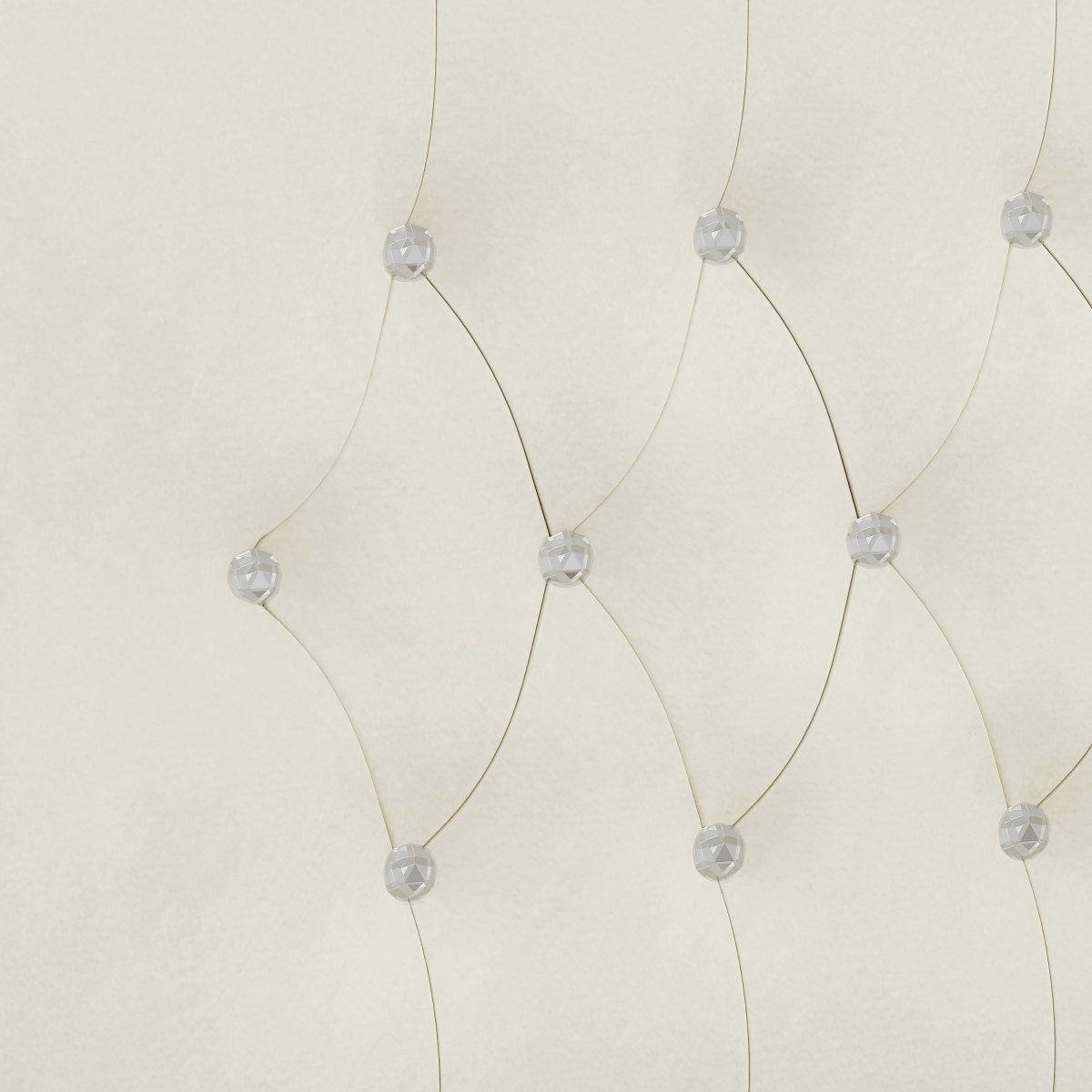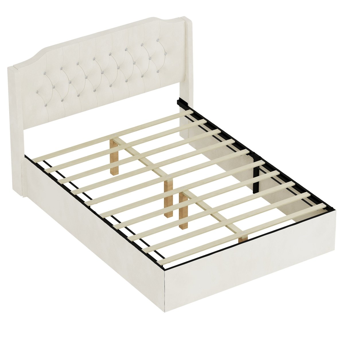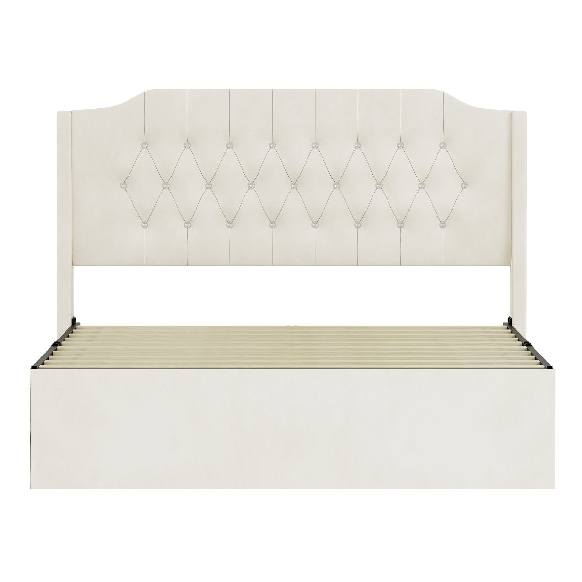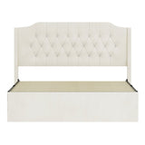The Bellamy bed combines soft textures and practical features to elevate any bedroom. Upholstered in beige velvet with crystal tufting, it features a wingback headboard with a top shelf for small essentials. Hidden under-bed storage and a removable side cover help keep your space organized. No box spring required.