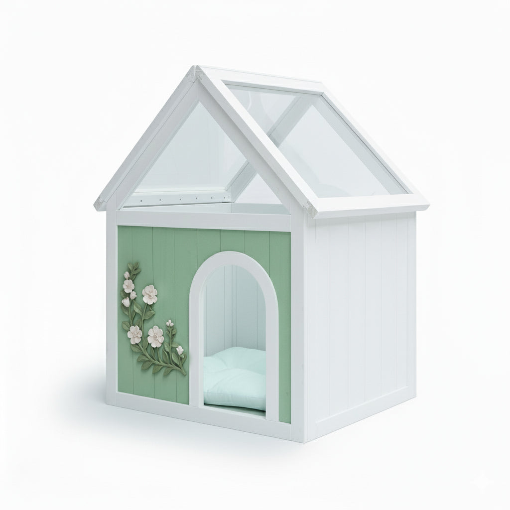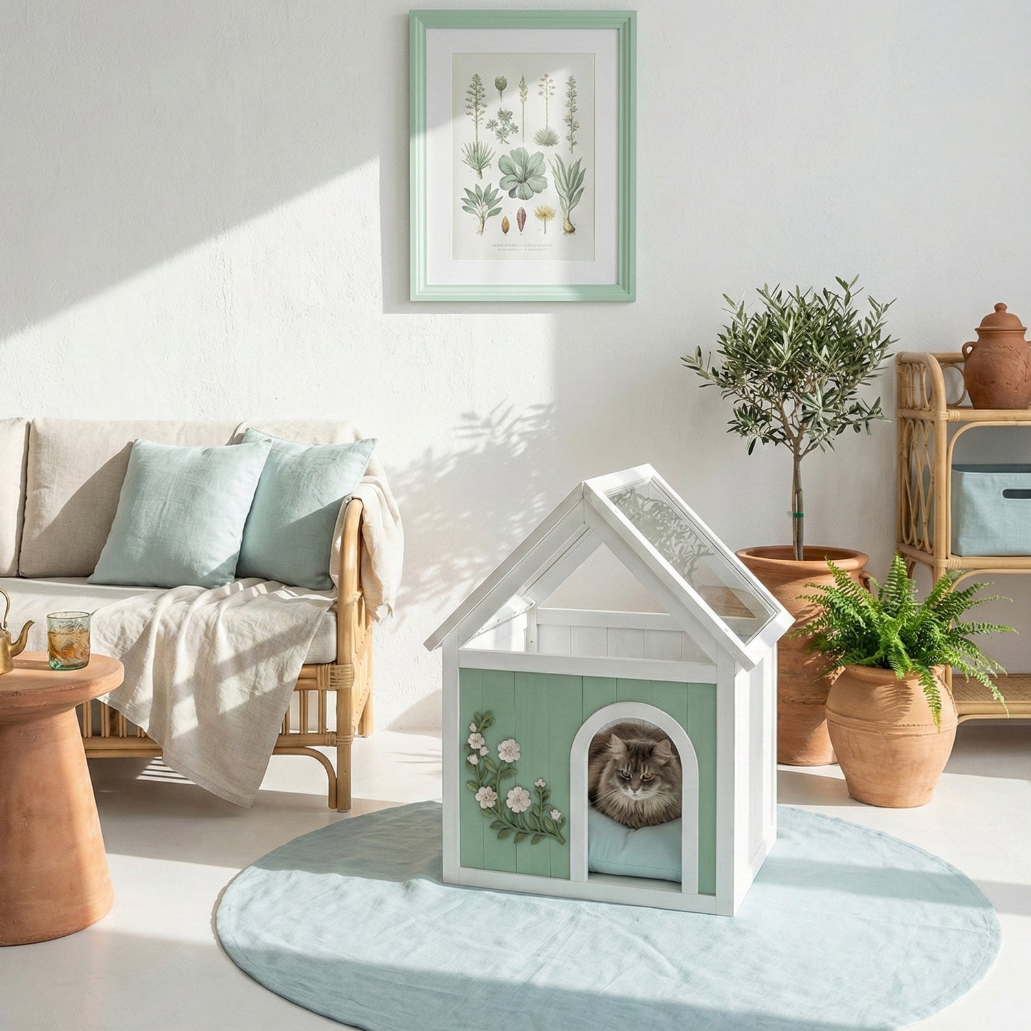 The Iberis is a masterfully crafted indoor sanctuary that seamlessly blends artistic detail with modern utility for cats and small dogs. Constructed from premium FSC-certified cedar wood featuring intricate floral carvings, this shelter is topped with a unique transparent acrylic roof that invites natural light while maintaining a sense of secure enclosure. Designed to complement Scandinavian and Japandi aesthetics, its flat top surface doubles as a functional side table, making it a perfect multifunctional piece for the modern home.
