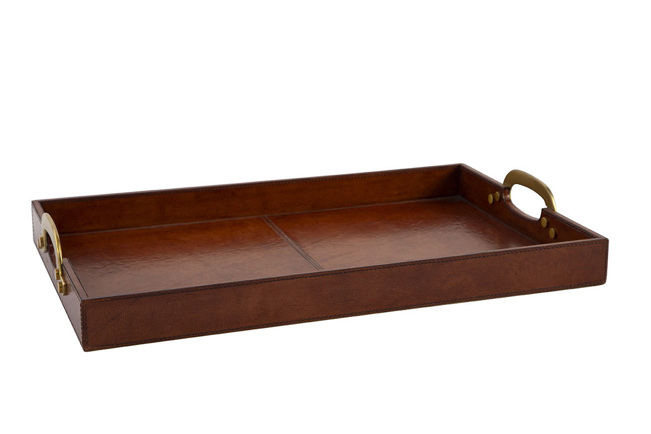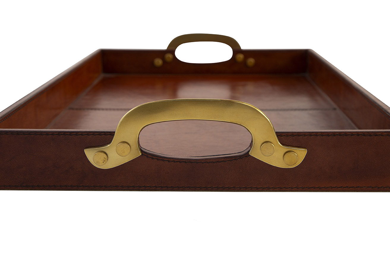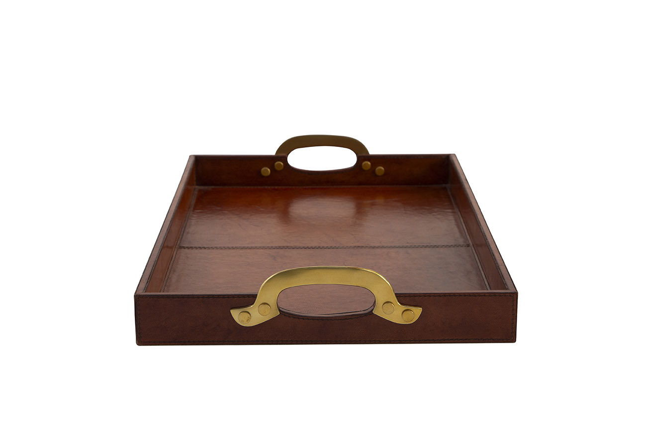 Greg's Tray offers a timeless elegance perfect for any sophisticated setting. Constructed from solid wood, it is wrapped in hand-tooled leather for a rich, textured look. The gold brass handles add a touch of refinement, making this tray ideal for serving or as a stylish decorative piece in any space.