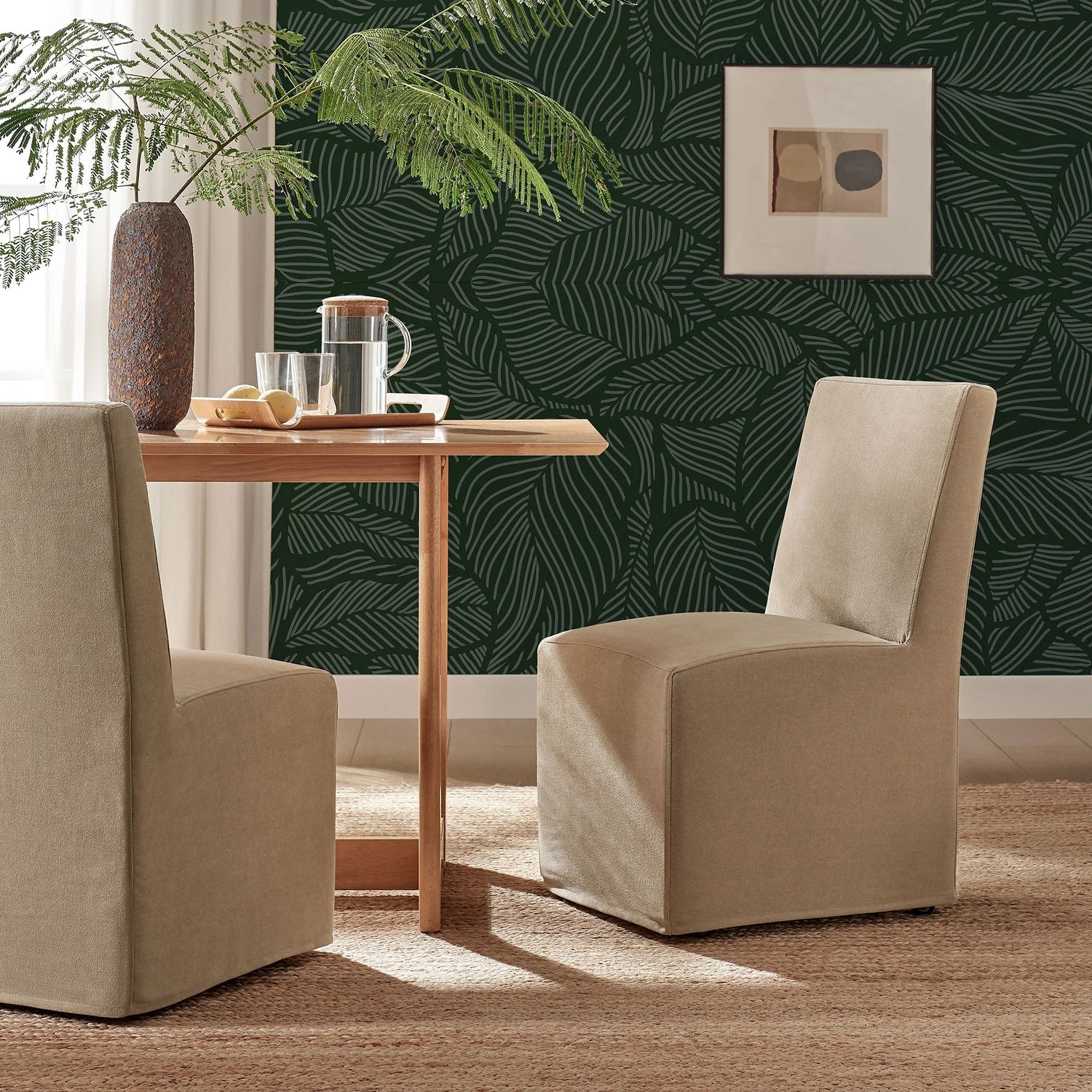 The Slipcovered Dining Side Chair brings a relaxed yet refined feel to your daily dining experience. Upholstered in a soft linen-blend fabric, this chair features a tailored, removable slipcover that provides a clean and put-together aesthetic. The tall backrest and padded seat offer supportive comfort, while hidden casters underneath ensure smooth movement around your table. Built on a sturdy kiln-dried wood frame, this versatile chair arrives fully assembled and complements modern farmhouse, coastal, and minimalist interiors.