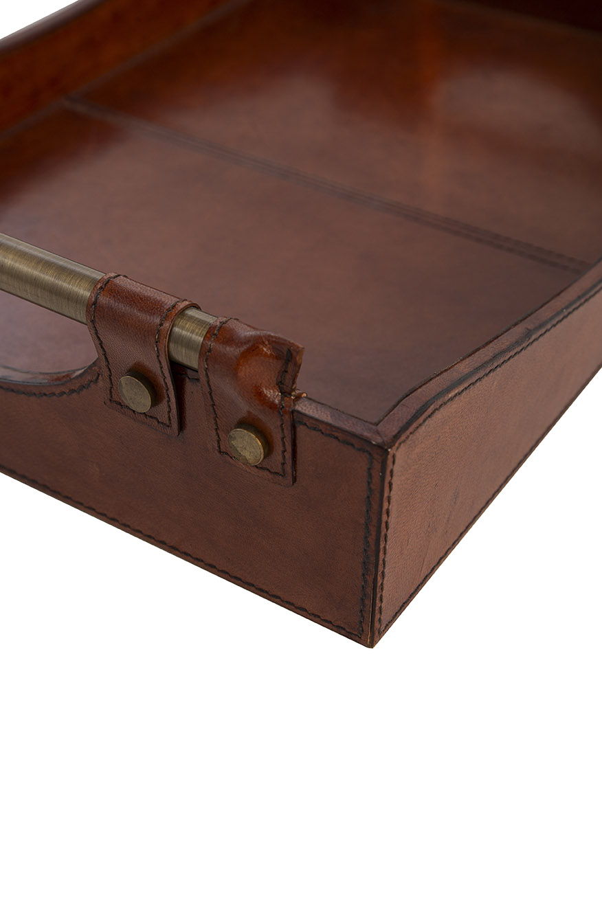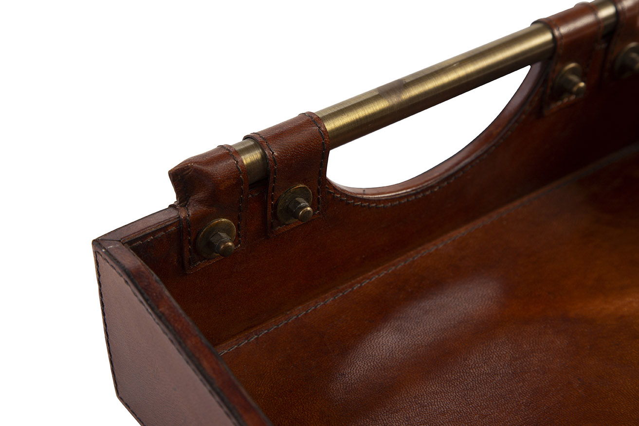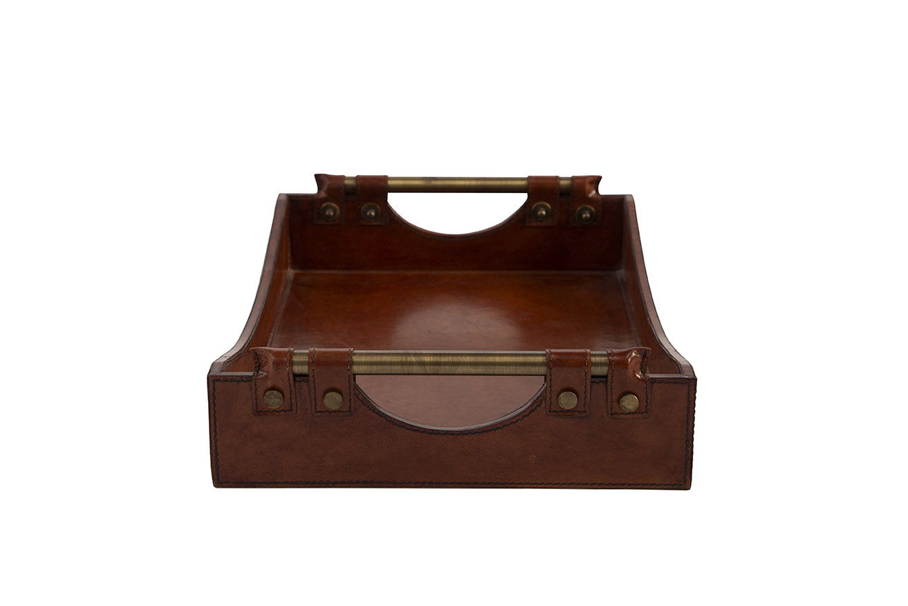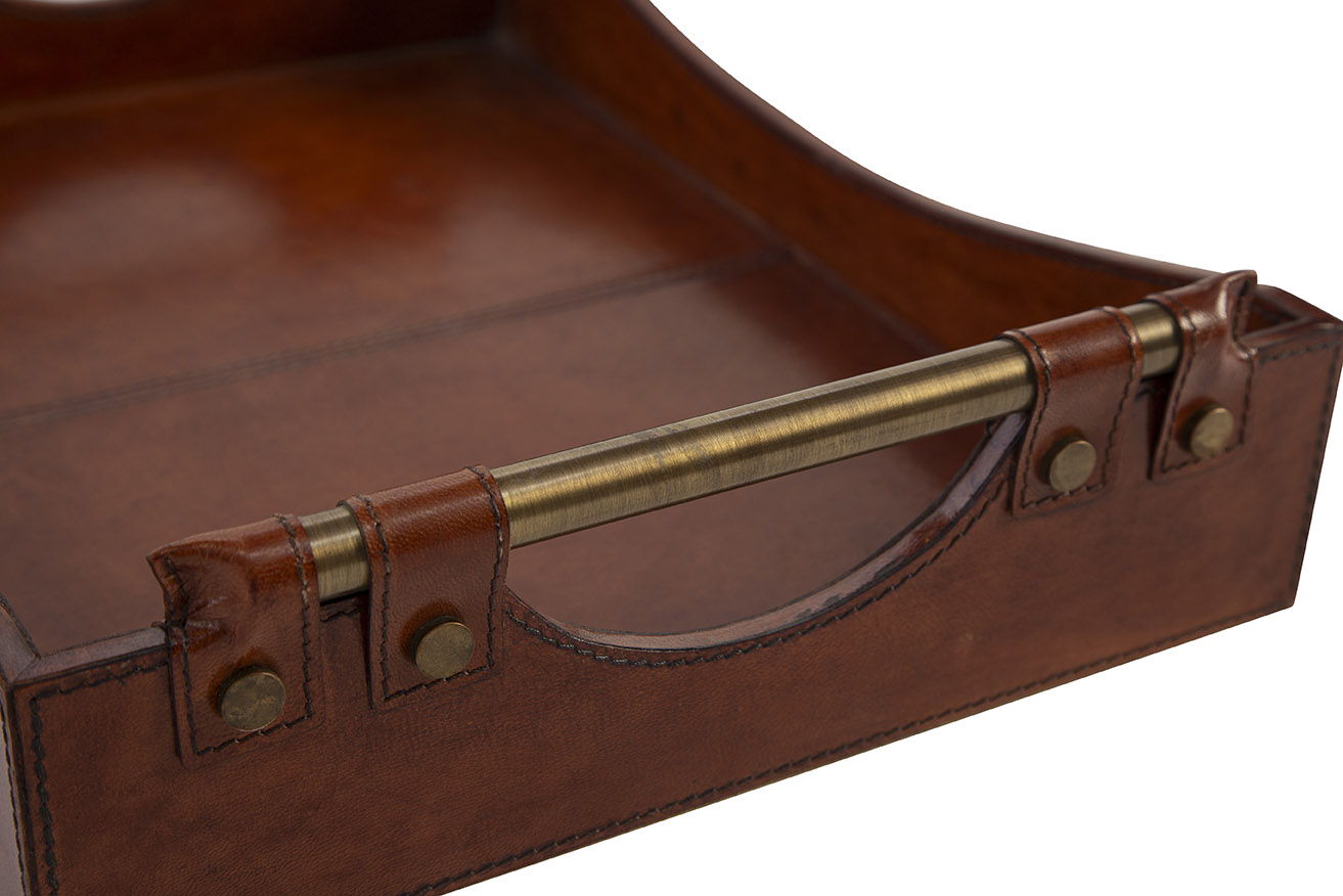 The Preakness Tray exudes an air of sophistication reminiscent of a gentlemen's club or polo club. Crafted from solid wood, it features a hand-tooled leather covering that adds texture and elegance. Beautiful gold brass handles complete the look, making this tray a refined and functional addition to your home or office décor.