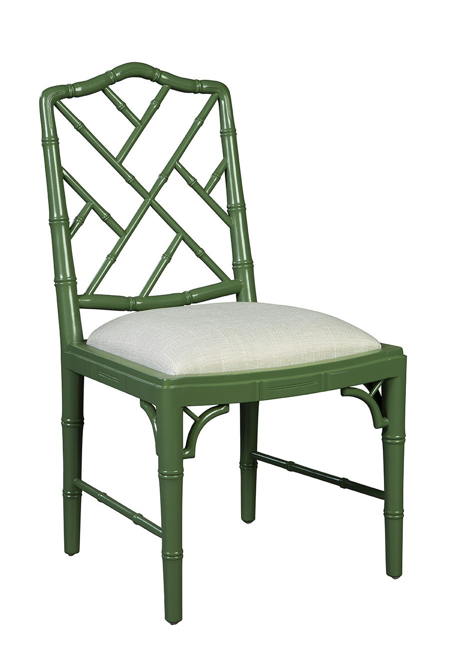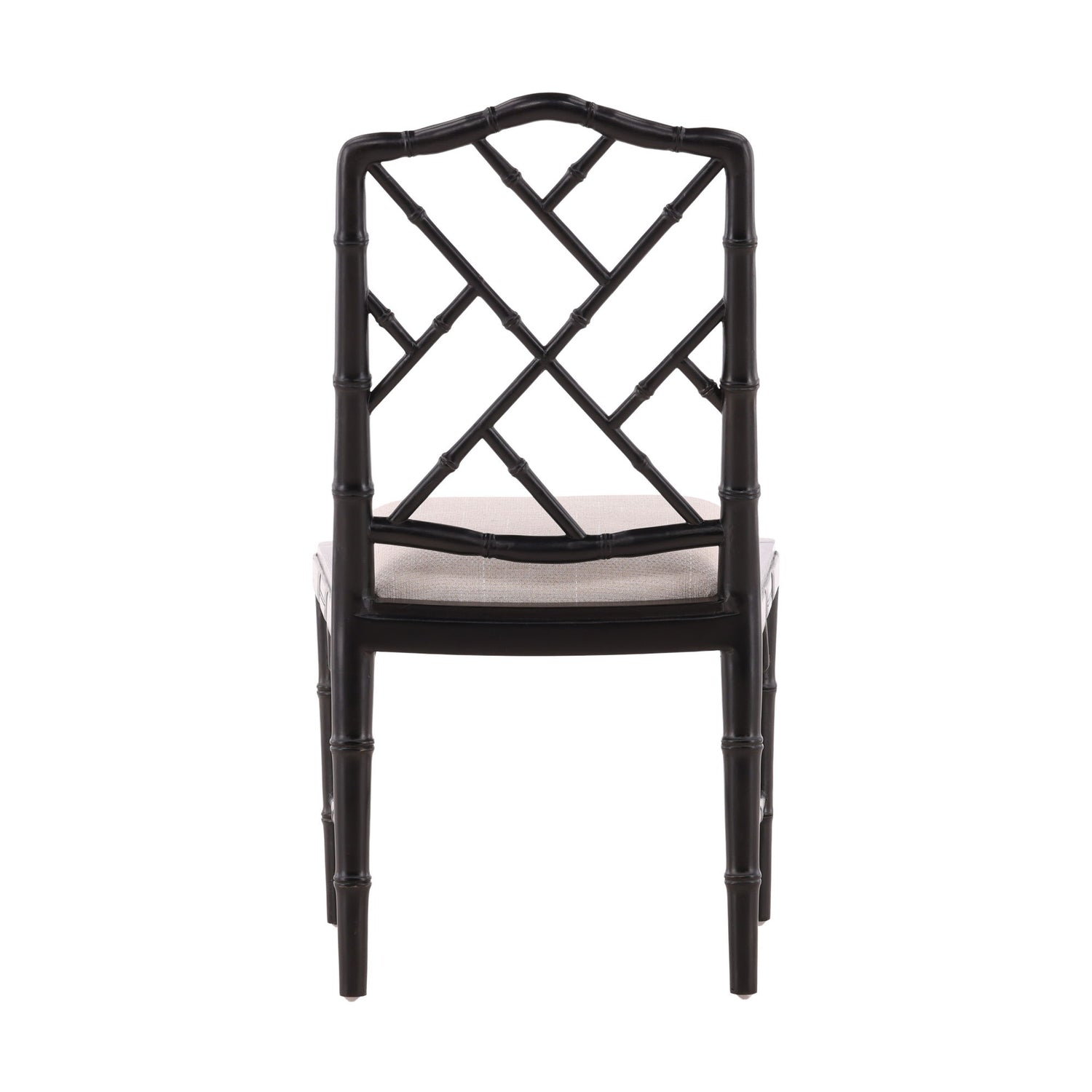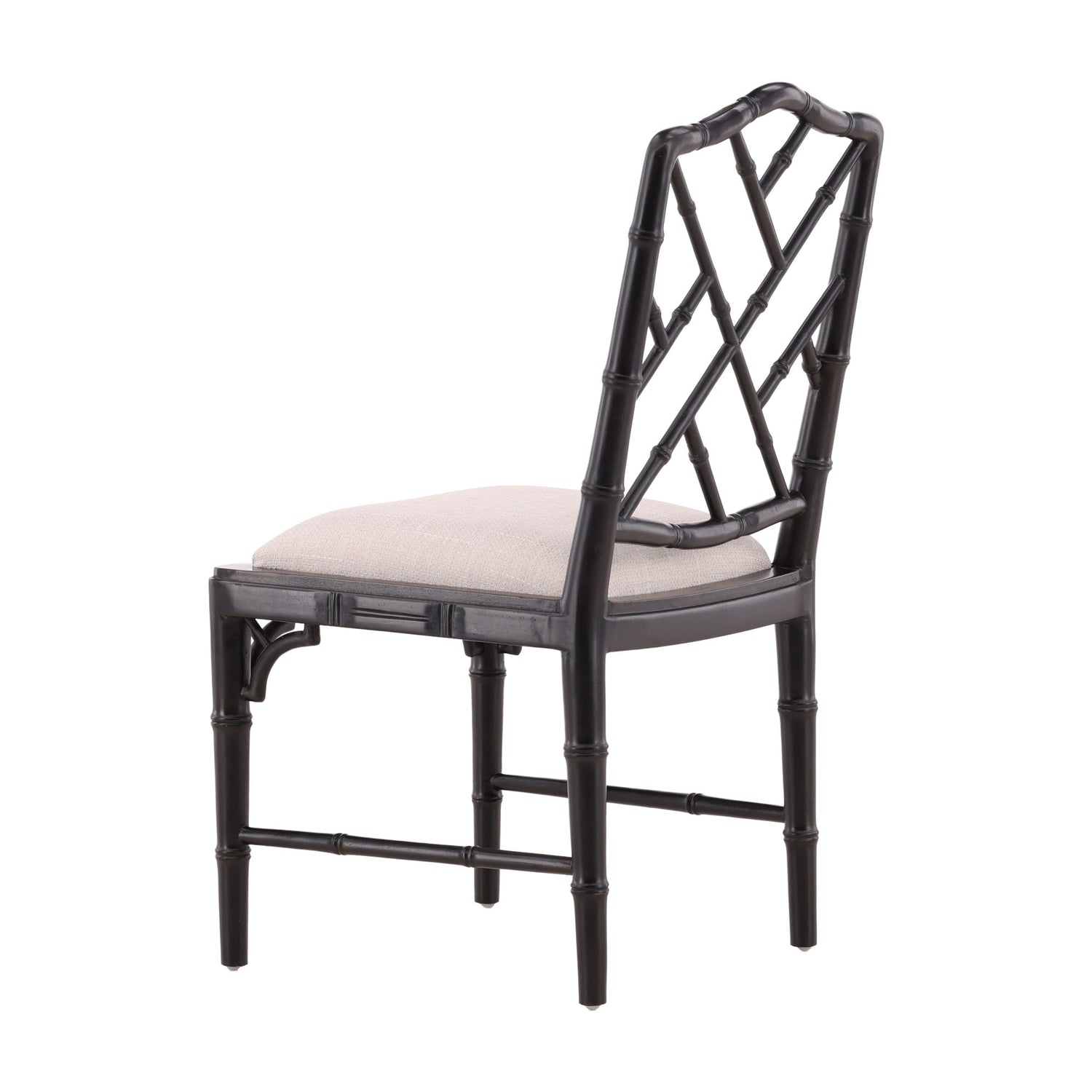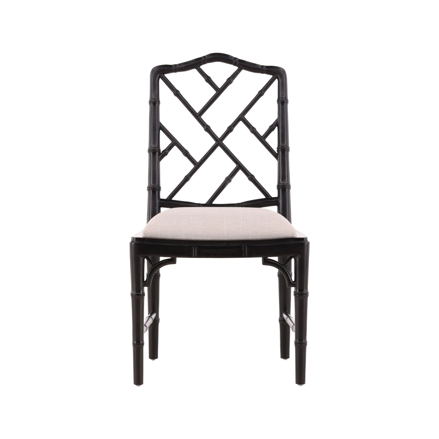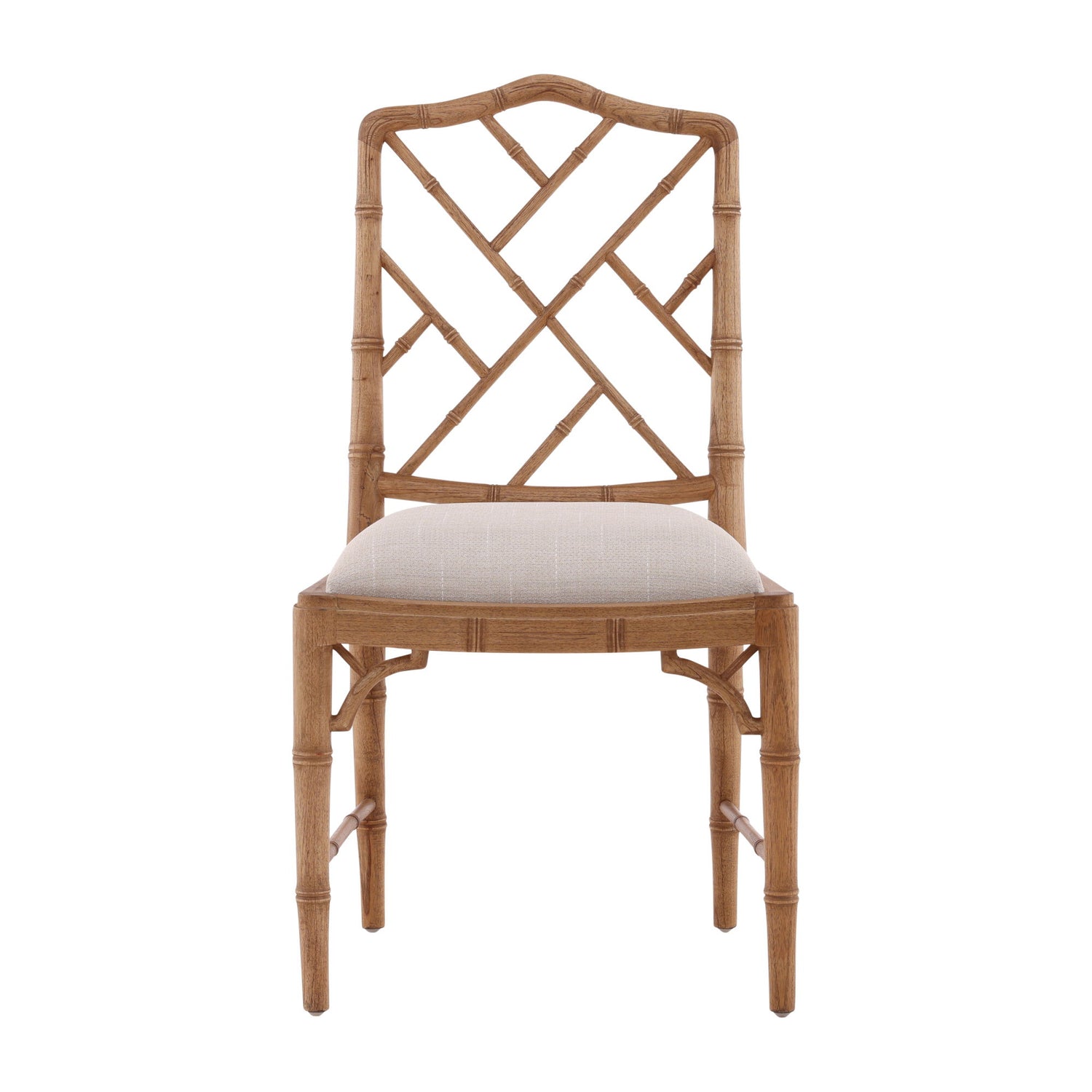 This handsome Chinese Chippendale side chair is as happy at a desk or vanity, as it is at your dining table. The solid mahogany frame belies its delicate appearance, and the neutral performance fabric on the drop in seat adds another touch of practicality to this stunningly stylish side chair.