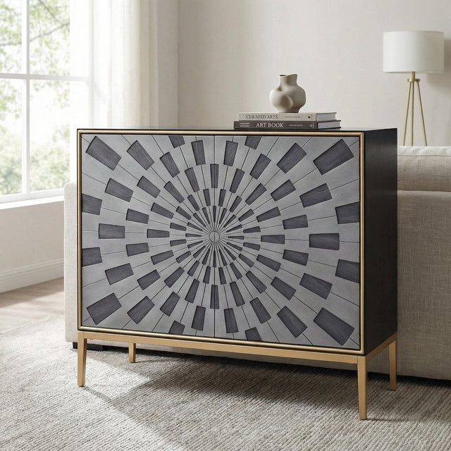 The Quilla Console Cabinet features a striking blend of black, gray, and brass finishes, offering a modern aesthetic that enhances any living space. Its contemporary rectangular design is supported by durable metal legs, ensuring both stability and a sophisticated silhouette.