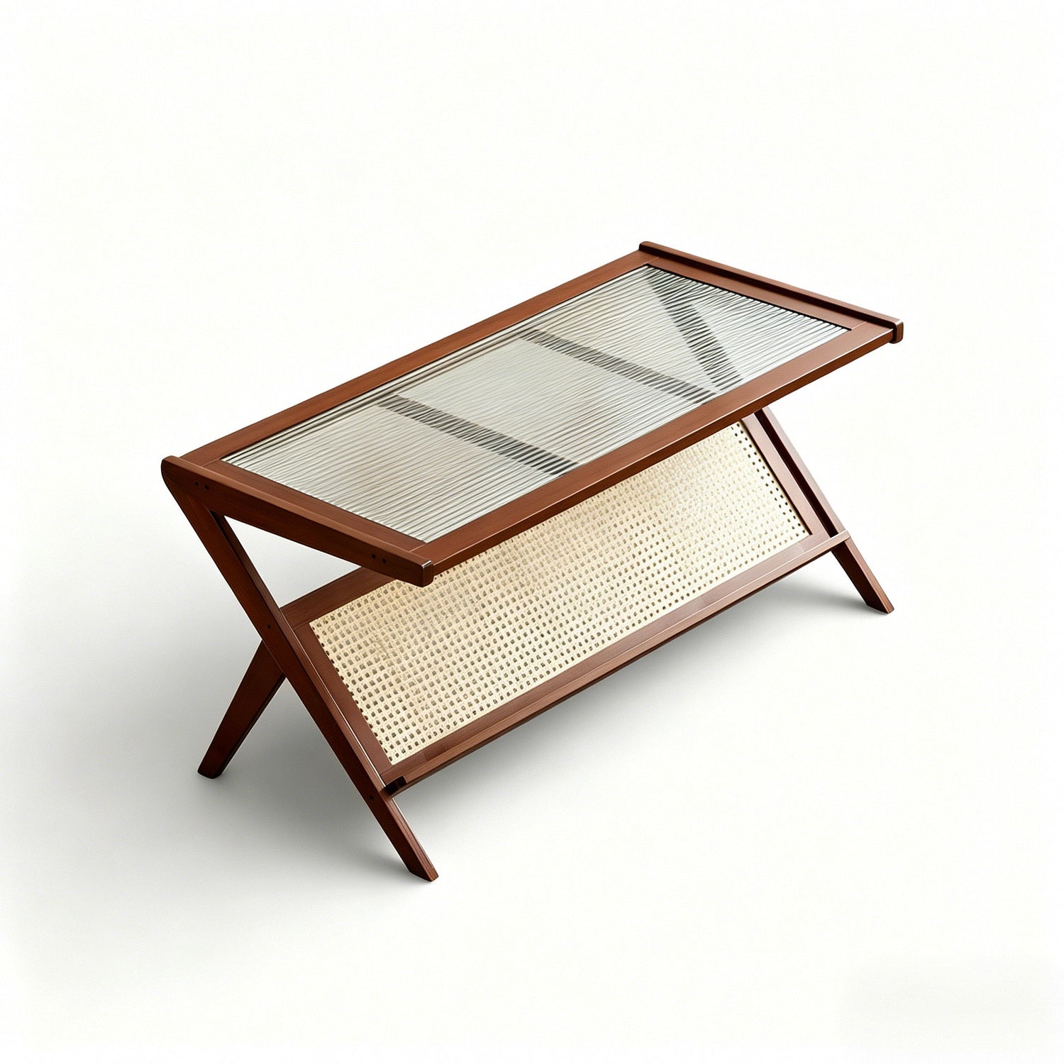 Rattan Coffee Tables For Living Room, Mid Century Modern Coffee Table With Glass Top, Large Boho Center Table With Storage - Brown