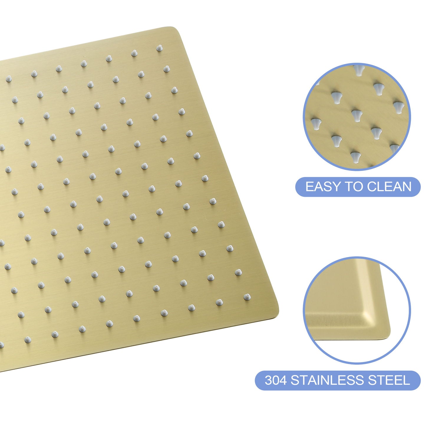 16" Square Stainless Steel Rainfall Shower Head Wall / Ceiling Mount With Self Cleaning Nozzles & Full Coverage Design - Gold