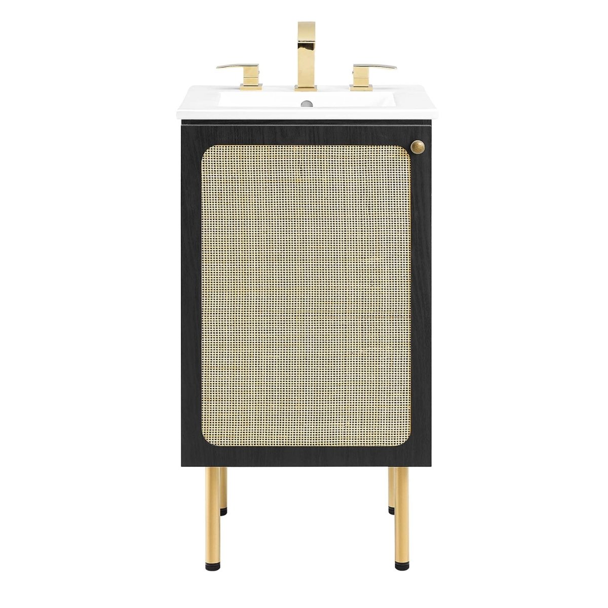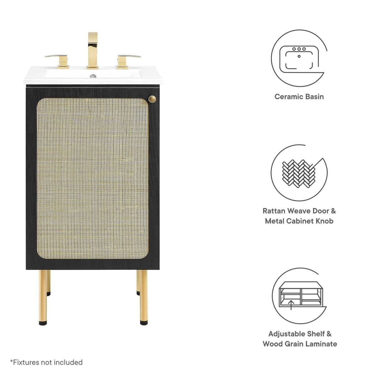 Update your bathroom or powder room with the organic charm of this 18-inch vanity in black and white. A rattan weave door adds natural texture, while the interior features an adjustable top shelf and fixed bottom shelf for storage. The integrated ceramic sink with 8" centerset holes brings a sleek modern touch to the design. Finished with a round metal knob and sturdy legs with adjustable feet, this vanity combines durability with unique style in a compact footprint.