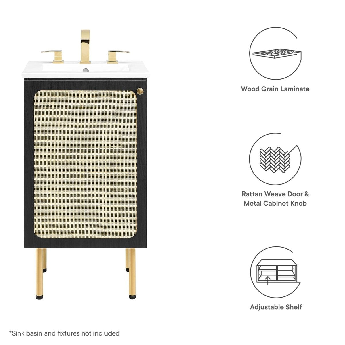 Compact and modern, this 18-inch black vanity cabinet makes a stylish addition to smaller bathrooms and powder rooms. Featuring a rattan weave door, it brings natural texture to your space while concealing practical storage. Inside, an adjustable top shelf and fixed bottom shelf provide room for toiletries and towels. Designed with a round metal knob and sleek legs with adjustable feet, this cabinet offers both stability and durability. Made with MDF, particleboard, and wood grain laminate, it combines organic aesthetics with contemporary design. Assembly required; sink basin not included.