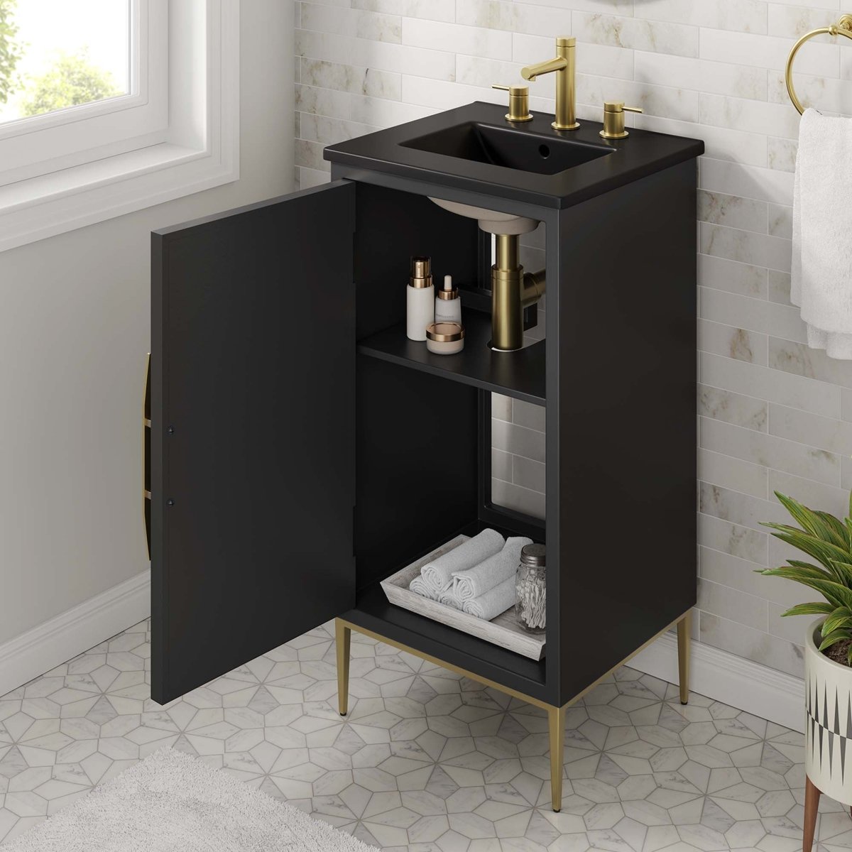 Bold and contemporary, this 18-inch bathroom vanity in full black finish makes a striking statement in compact spaces. Designed with a radial door pattern and sleek gold hardware, it combines style with function. The ceramic sink basin with integrated countertop and 8" centerset holes ensures durability and ease of use. A concealed storage shelf behind the detailed door keeps essentials neatly tucked away. Resting on a gold base with non-marking foot pads, this vanity blends strength with elegance.