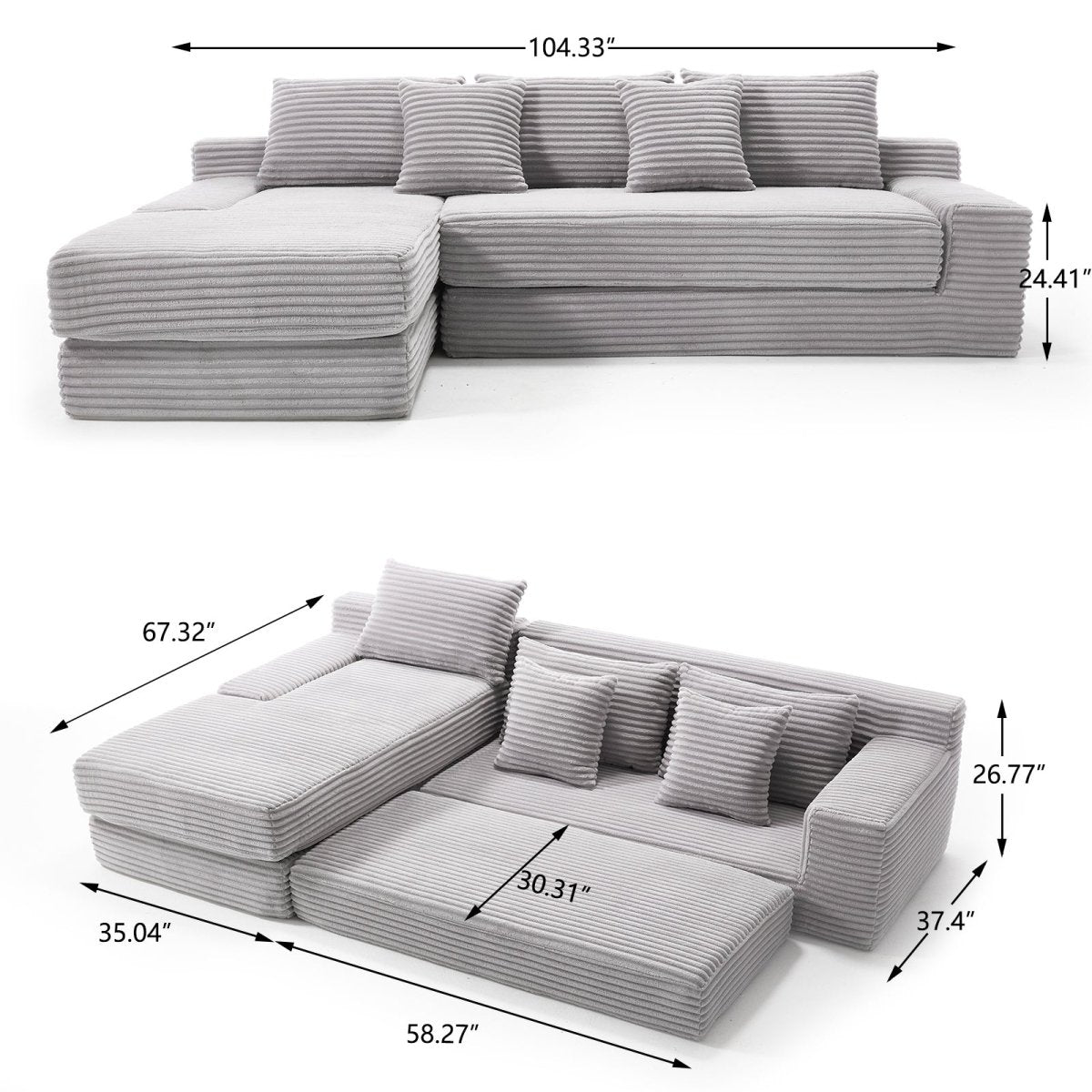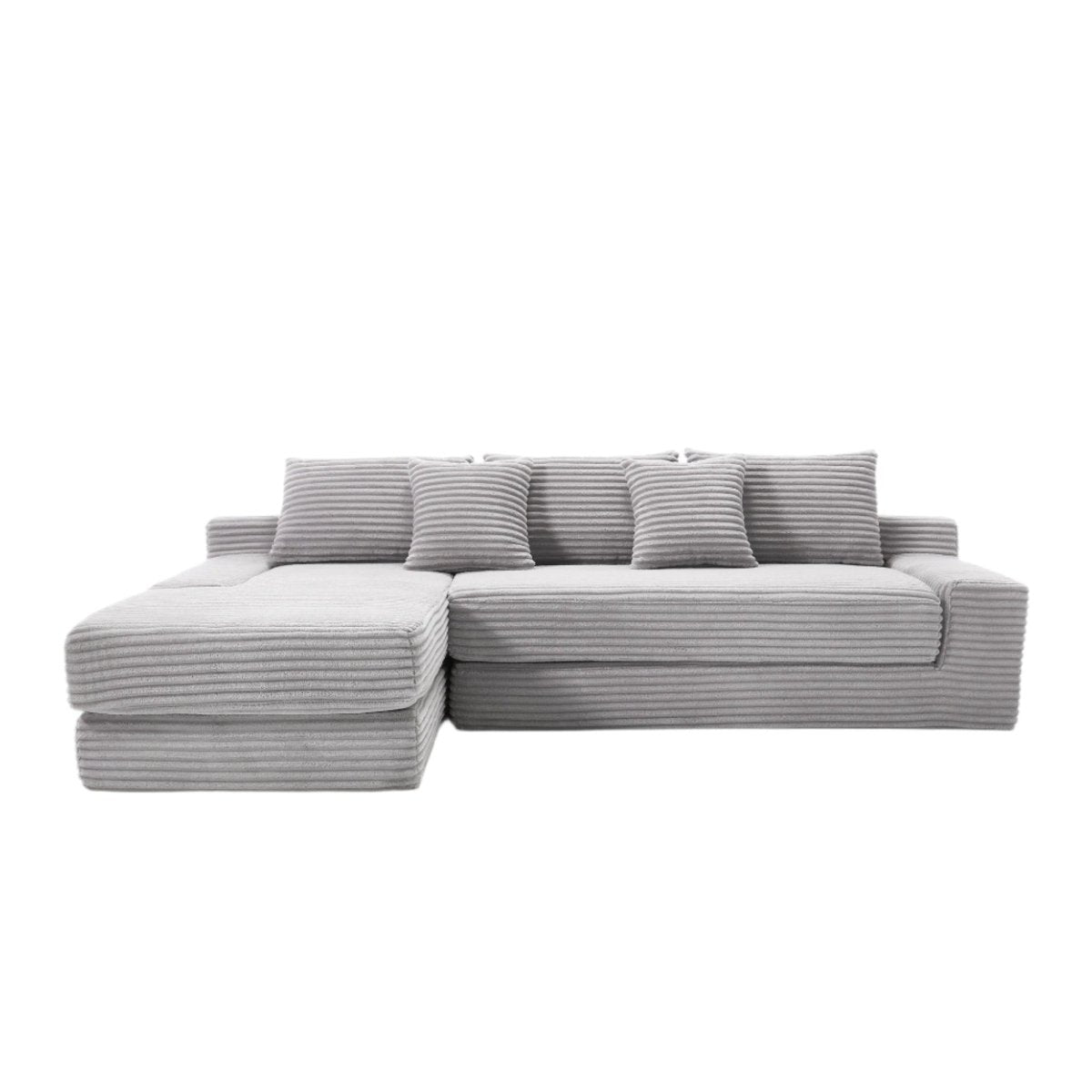 Experience modern comfort with the Vista sectional — an L-shaped corduroy sofa designed for flexible living. Its memory foam cushions provide plush support, while a durable steel frame ensures lasting structure. This space-saving couch easily converts into a sleeper and ships in compression packaging for quick, no-tool setup. Available in light gray or black here at Alpine Outlets.